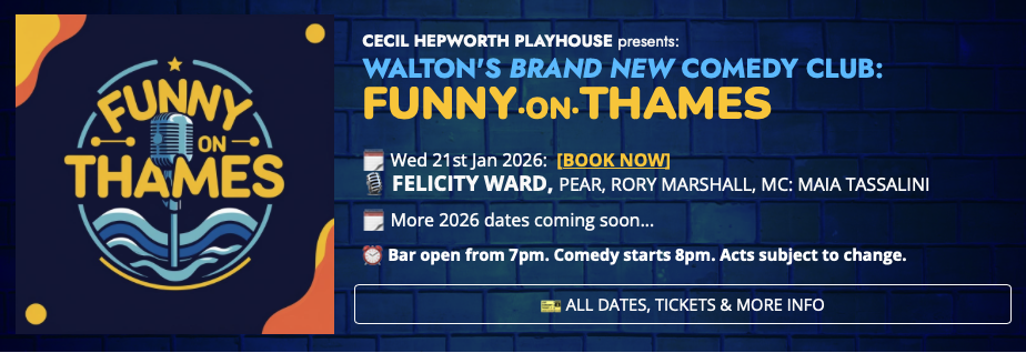 The Cecil Hepworth Playhouse, 1 Bonham Gate, Walton-on-Thames. Comedy starts at 8pm. Tickets here.